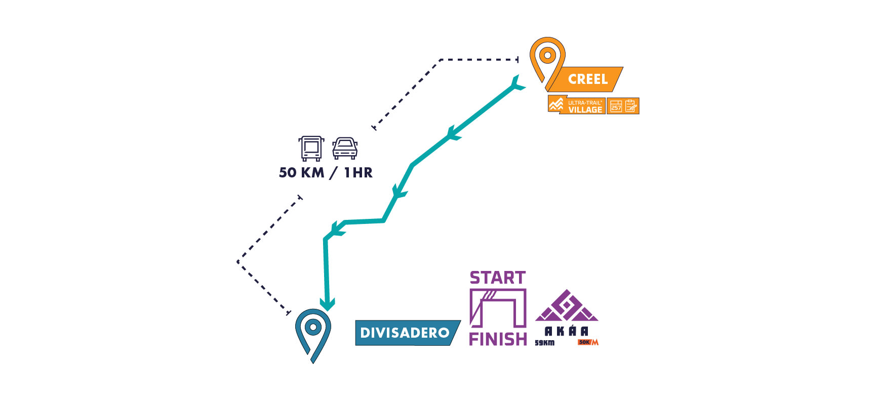 The Akáa 59K race does not have any aid stations with permitted support; therefore, no official transportation will be provided by the organization to points along the course.