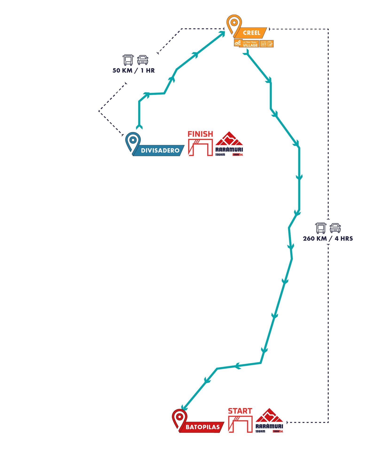 Please note: The only official shuttle provided by the organization is to the start line in Batopilas. Access to aid stations with permitted support—Urique, Guytaibo, and Panorámica—is restricted to those wearing the official Support Crew wristband, and no official shuttle service will be provided to these points.